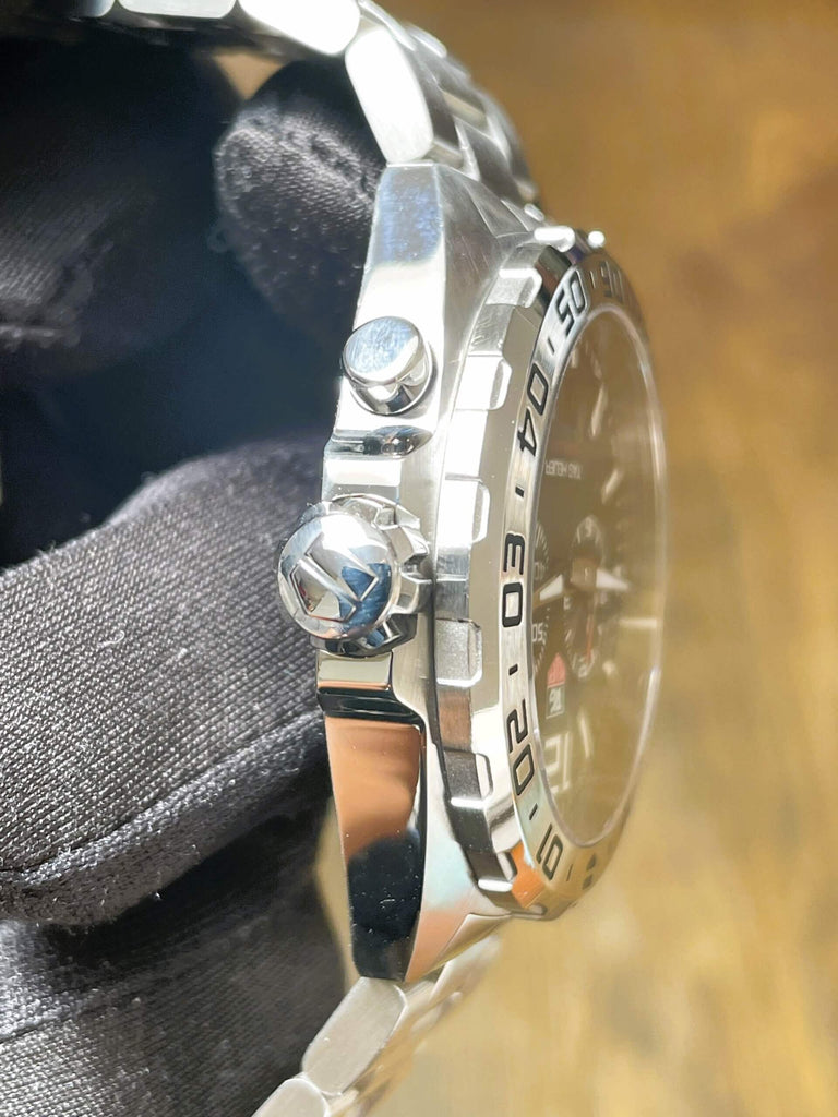 The racing-inspired notches on the 12-hour scale fixed bezel is an emblematic feature of TAG Heuer’s most accessible luxury collection. The only series with the brand’s white, red and green shield, it is a very popular watch in the entry-level luxury category.