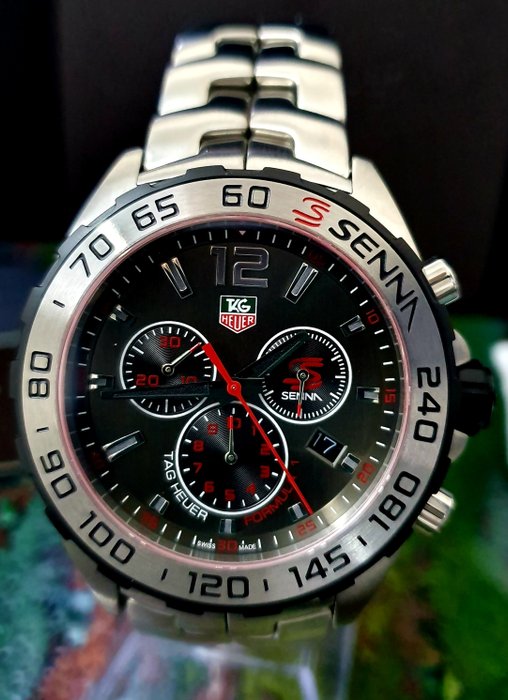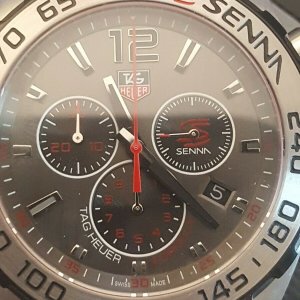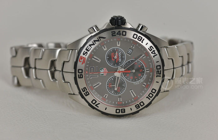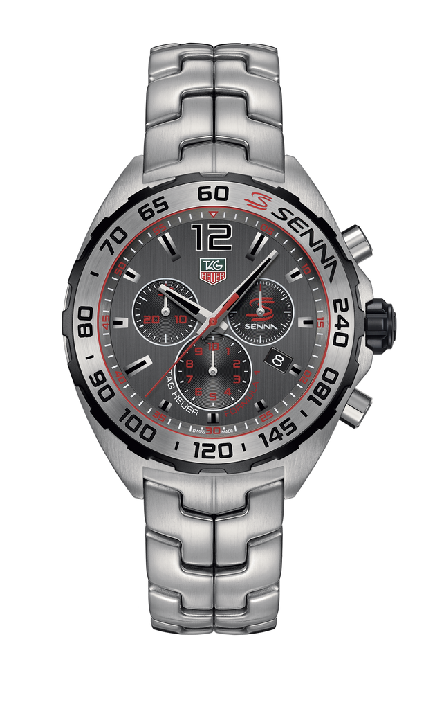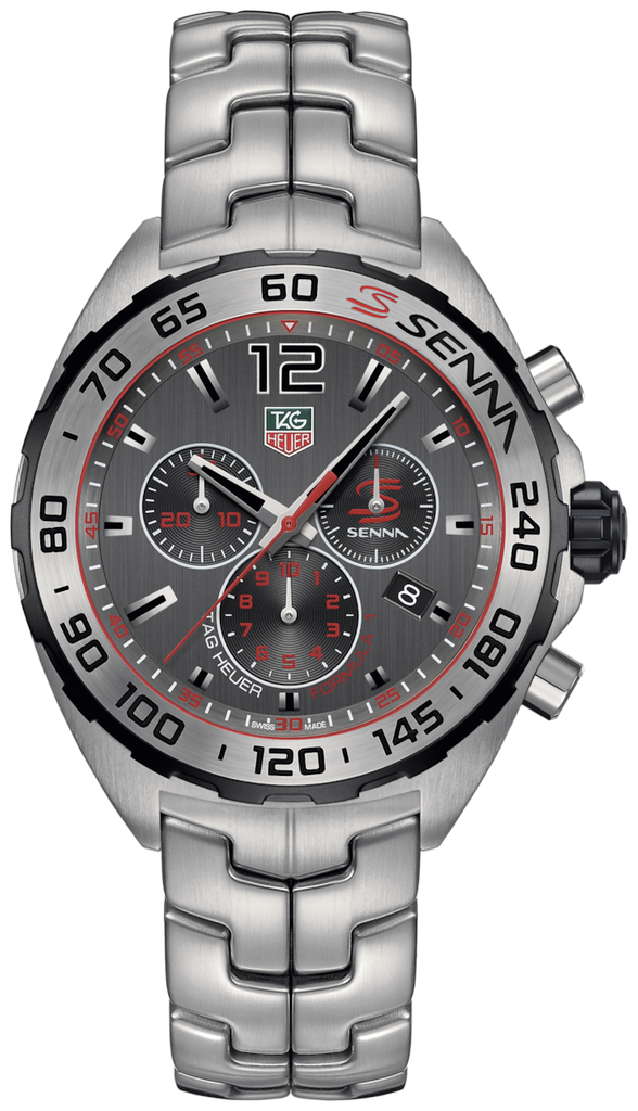 Swiss-made, this bold TAG Heuer Formula 1 is an aesthetic 43 mm watch. This model features a Steel case and a Quartz movement.Stainless steel case with a stainless steel bracelet. Fixed black titanium carbide bezel with a stainless steel top ring. Grey dial with luminous silver-tone hands and index hour markers. Arabic numeral appears at the 12 o'clock position. minute markers around the outer rim. Dial Type: Analog. Luminescent hands and markers. Date display at the 4 o'clock position.